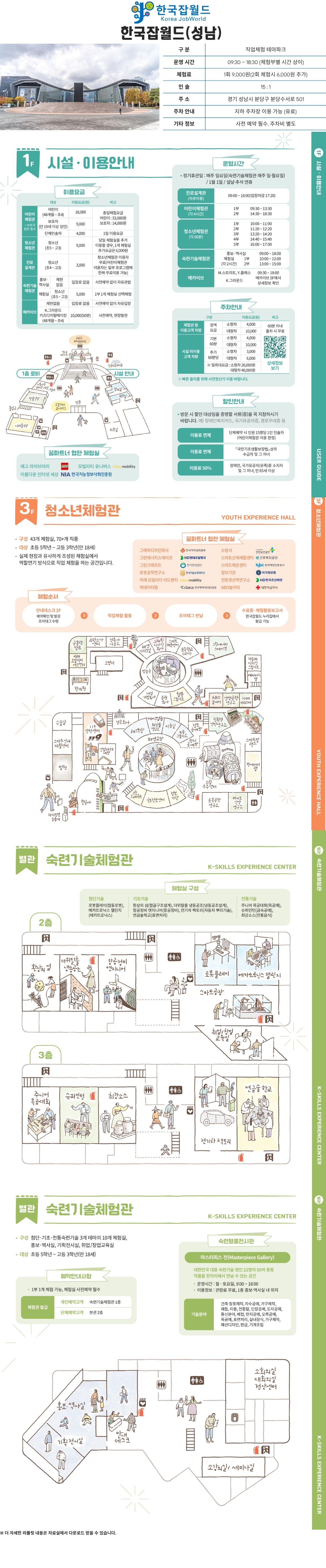 한국잡월드(성남)는 국내 최대 규모를 자랑하는 어린이·청소년 종합 직업체험관으로, 미래 사회의 주역이 될 학생들에게 생생한 직업 탐색의 기회를 제공합니다. 수도권에 위치하여 서울 및 경기 지역 학교 단체의 접근성이 뛰어나며, 체험학습과 수학여행 일정에 완벽하게 부합합니다. 학생들은 실제 직업 현장처럼 꾸며진 수백 개의 부스에서 다양한 직업을 직접 경험하며 자신의 적성과 흥미를 발견할 수 있습니다. 안전하고 체계적인 운영 시스템과 전문 강사진은 학생들에게는 몰입감 높은 교육을, 인솔 교사에게는 신뢰할 수 있는 현장학습 환경을 보장합니다. 한국잡월드, 교실 밖에서 만나는 가장 현실적이고 즐거운 미래 설계의 첫걸음입니다.