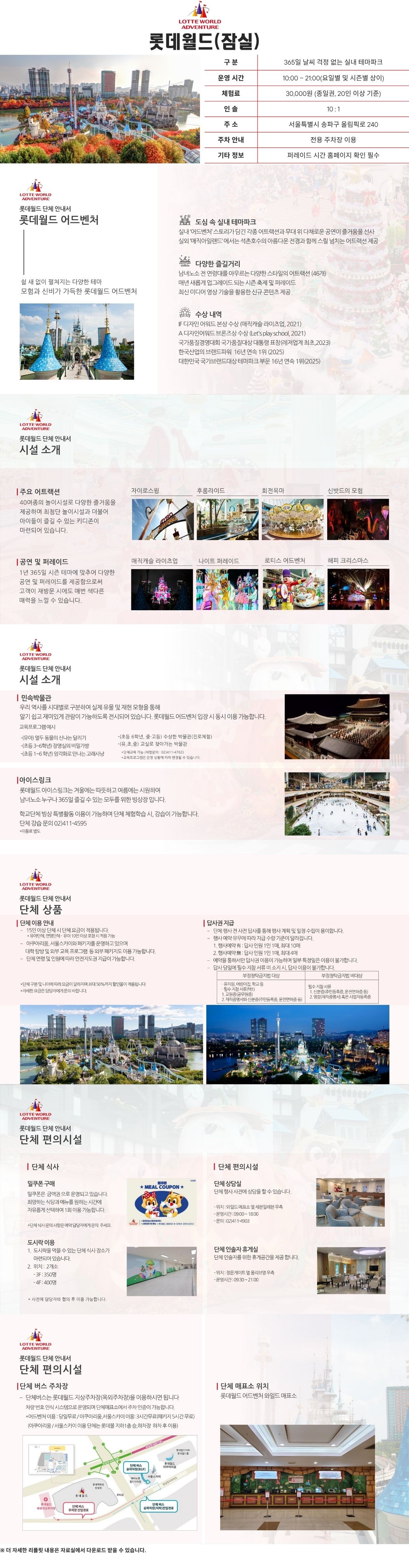 롯데월드(서울)는 도심 속 환상의 섬, 어드벤처와 매직아일랜드가 어우러진 대한민국 대표 테마파크입니다. 학생 단체와 수학여행객에게 잊을 수 없는 즐거움과 모험을 선사합니다. 서울 잠실에 위치하여 수도권 어디서나 뛰어난 접근성을 자랑하며, 365일 날씨에 구애받지 않는 실내 공간은 체험학습 일정에 안정성을 더해줍니다. 짜릿한 어트랙션은 물론, 매일 펼쳐지는 화려한 퍼레이드와 시즌별 공연은 학생들에게 특별한 추억을 선물합니다. 안전한 시설 관리와 대규모 인원을 수용할 수 있는 편의시설은 학생들에게는 최고의 즐거움을, 인솔 교사에게는 편안한 운영 환경을 제공합니다. 롯데월드, 교실 밖에서 만나는 가장 짜릿하고 환상적인 단체 활동의 중심입니다.