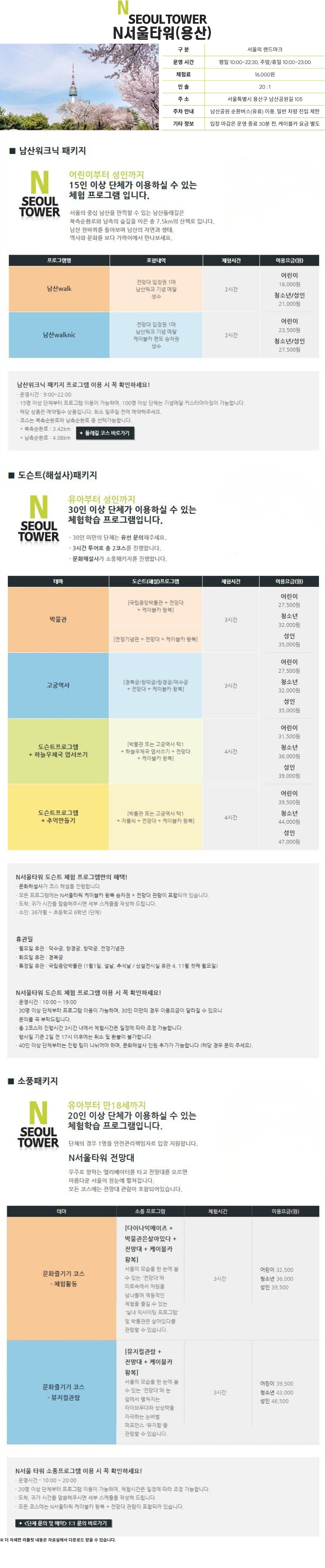 N서울타워(용산)는 서울의 하늘과 가장 가까운 상징적인 랜드마크로, 학생 단체와 수학여행객에게 잊을 수 없는 도심의 풍경을 선사합니다. 남산 정상에 위치하여 서울의 중심을 한눈에 조망할 수 있으며, 케이블카 및 순환버스를 통해 편리하게 방문할 수 있습니다. 360도 파노라마로 펼쳐지는 전망대에서 바라보는 서울의 전경은 학생들에게 수도 서울의 웅장함과 아름다움을 동시에 느끼게 합니다. 교실 밖, 가장 높은 곳에서 만나는 탁 트인 전망은 잊지 못할 특별한 추억이 될 것입니다.