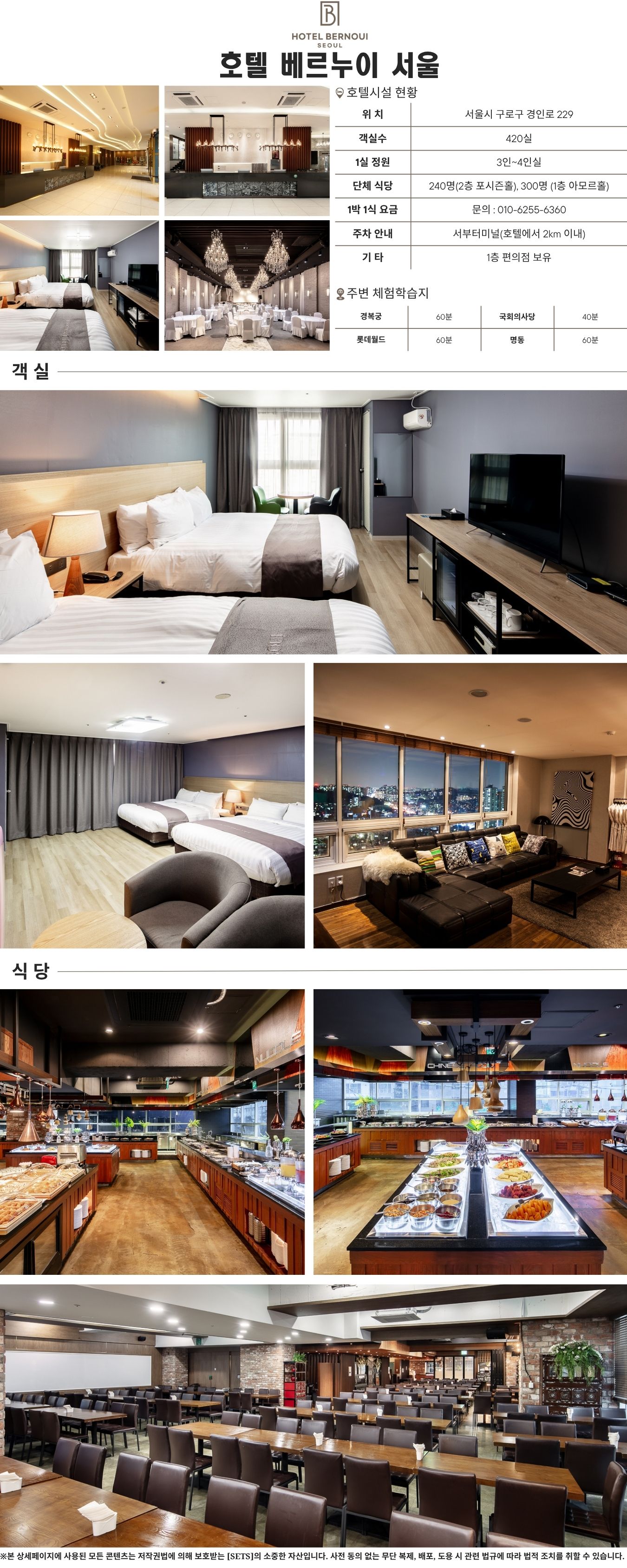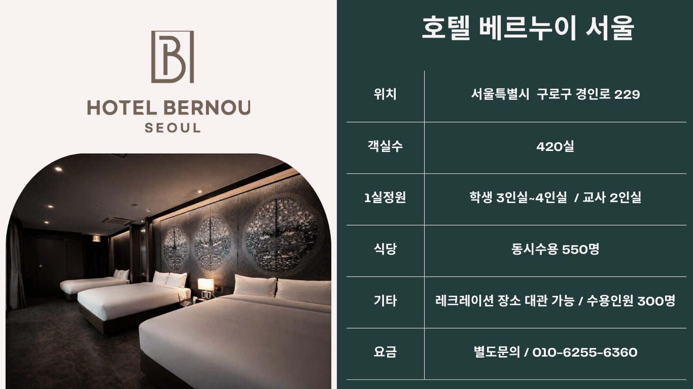 호텔 베르누이 서울(Hotel Bernoui Seoul)은 지상 23층 규모의 대형 호텔로, 421개 이상의 객실과 컨벤션홀, 연회장을 갖춘 학생단체 맞춤형 도심형 호텔입니다.