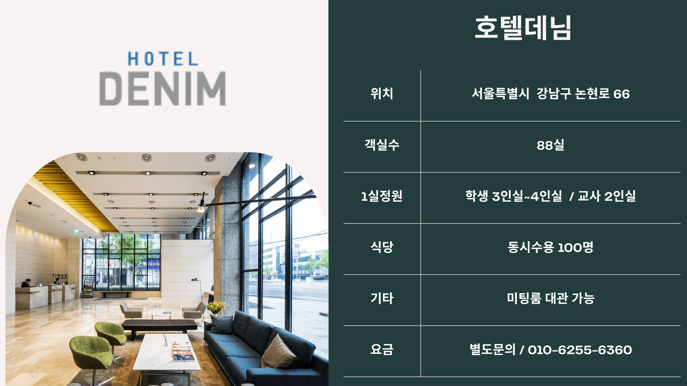 호텔 데님(Hotel Denim Seoul)은 서울 강남구 개포동에 위치한 모던 감성의 부티크 호텔로, 학생단체와 단체 여행객에게 편안하고 세련된 숙박 환경을 제공합니다.
